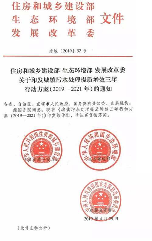 為貫徹落實全國生態(tài)環(huán)境保護大會、中央經(jīng)濟工作會議精神和《政府工作報告》部署要求,加快補齊城鎮(zhèn)污水收集和處理設(shè)施短板,盡快實現(xiàn)污水管網(wǎng)全覆蓋、全收集、全處理,經(jīng)國務(wù)院同意,住房和城鄉(xiāng)建設(shè)部、生態(tài)環(huán)境部、發(fā)展改革委印發(fā)《城鎮(zhèn)污水處理提質(zhì)增效三年行動方案(2019-2021年)》(建城〔2019〕52號,2019年4月29日)。